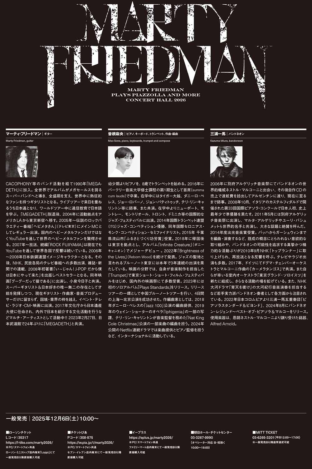 マーティ・フリードマン Marty Friedman Plays Piazzolla And More Concert Hall 2026🎸ギターが泣く、叫ぶ、謳う。伝説のギタリスト、ホールを揺るがす!